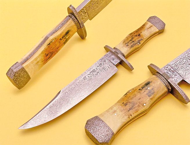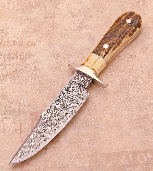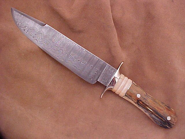 Feather Damascus and the handle is Walrus Ivory. The fittings are