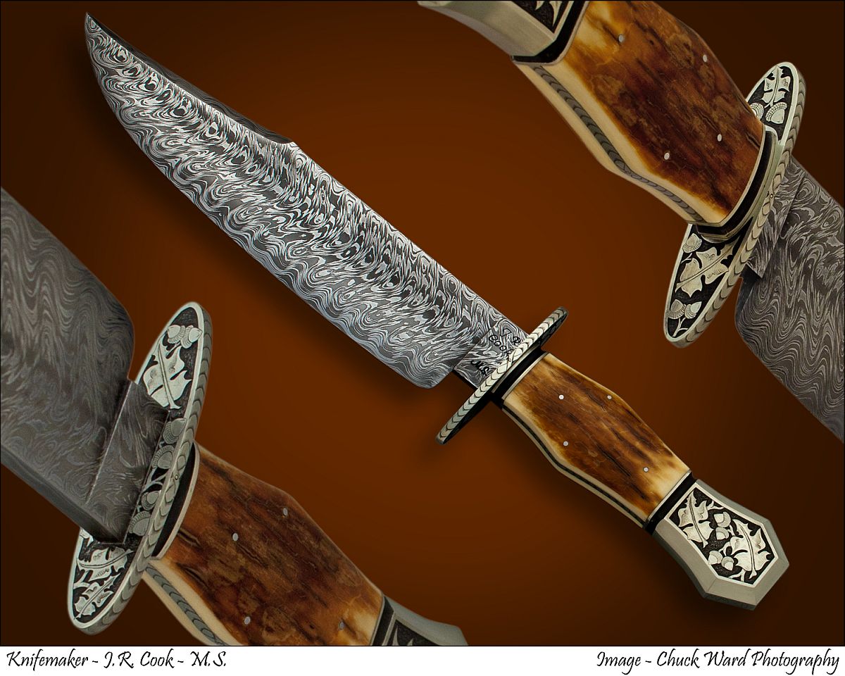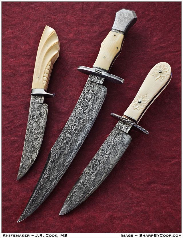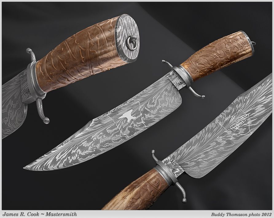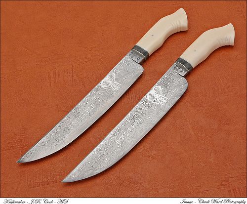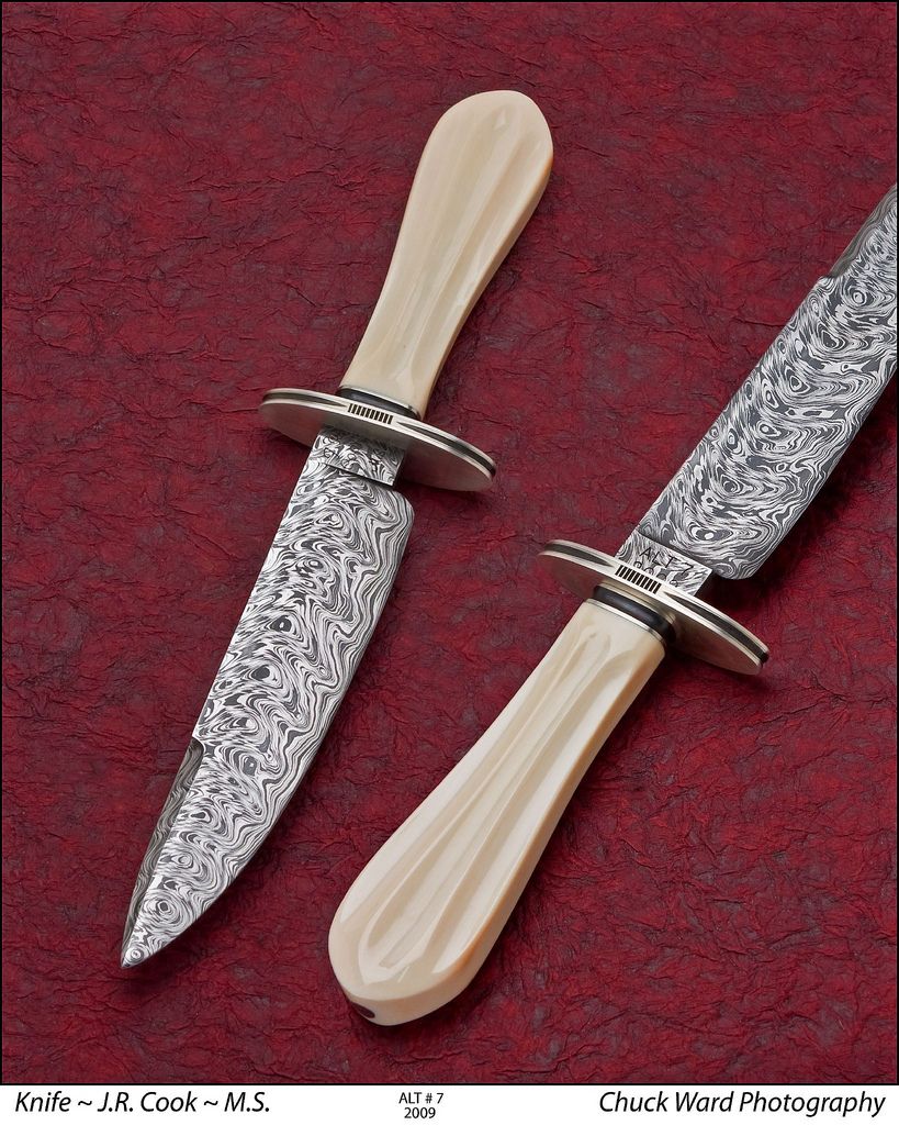 This is a link to a video of JR Cook Arkansas Living Treasure Click here to play video. Here is some of them I have completed in the past. ALT # 2 2007 Damascus and Iron wood. ![]() ALT # 3 2007 Damascus and Mammoth Ivory The blade is 7-3/4" ![]() ALT # 5 2007 Damascus and Blackwood The Blade is 4-5/8" ![]() ALT No number. 2007 This is my knife and is marked so on the guard It is the only ALT that is not numbered. All ALT knives made for me will not be numbered, just the year date will be stamped on the knife. The blade is 10-1/4" the handle is maple. ![]() ALT # 1 2008 Damascus and Iron wood ![]() ALT # 2 2008 Damascus blade with Mammoth Ivory on Iron frame and fittings. ![]() ALT # 3 and # 4 2008 Damascus Camp knives ![]() ALT # 6 2008 Damascus with Mammoth and Walrus Ivory handle ![]() Arkansas Tooth Pick Double edge. ALT #7 2008 ![]() Musso Bowie : ALT # 5 2009 ![]()