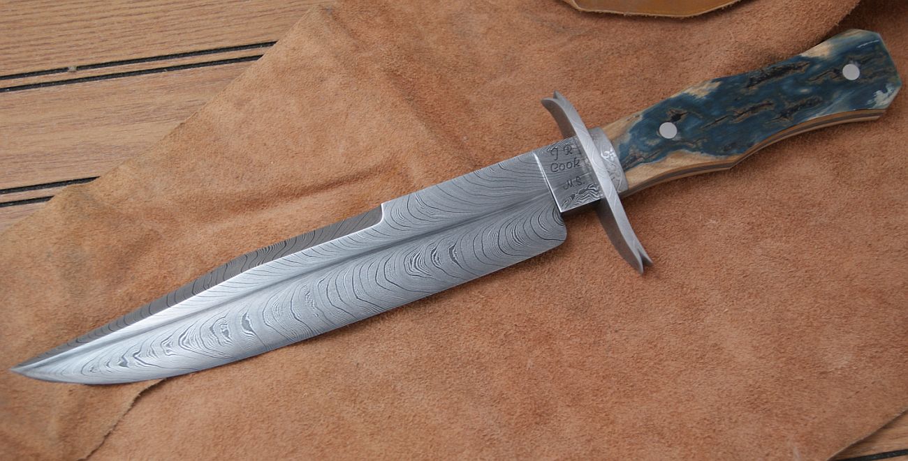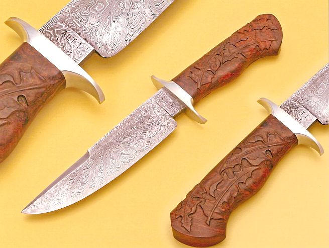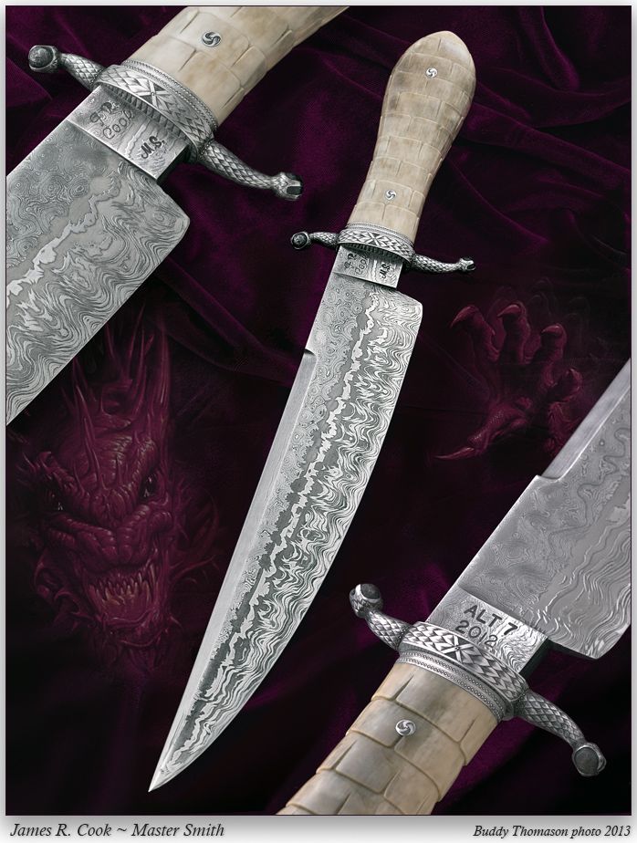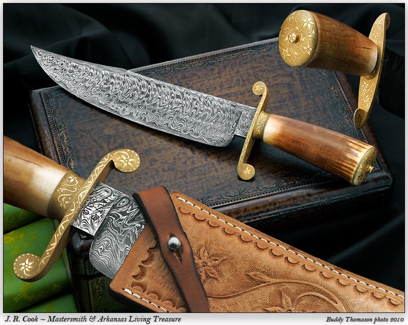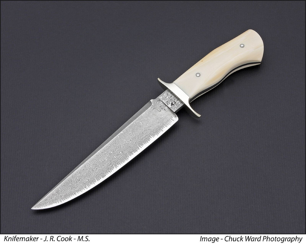 This is a link to a video of JR Cook Arkansas Living Treasure Click here to play video. Here is some of them I have completed in the past. ALT # 2 2007 Damascus and Iron wood. ![]() ALT # 3 2007 Damascus and Mammoth Ivory The blade is 7-3/4" ![]() ALT # 5 2007 Damascus and Blackwood The Blade is 4-5/8" ![]() ALT No number. 2007 This is my knife and is marked so on the guard It is the only ALT that is not numbered. All ALT knives made for me will not be numbered, just the year date will be stamped on the knife. The blade is 10-1/4" the handle is maple. ![]() ALT # 1 2008 Damascus and Iron wood ![]() ALT # 2 2008 Damascus blade with Mammoth Ivory on Iron frame and fittings. ![]() ALT # 3 and # 4 2008 Damascus Camp knives ![]() ALT # 6 2008 Damascus with Mammoth and Walrus Ivory handle ![]() Arkansas Tooth Pick Double edge. ALT #7 2008 ![]() Musso Bowie : ALT # 5 2009 ![]()